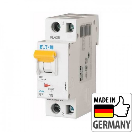 Автоматичний вимикач EATON серії PL7 призначений для захисту електричних ланцюгів від струмів короткого замикання та перенавантаження. Легко монтується на DIN-рейку, прямокутний індикатор положення контактів (увімкнено / вимкнено), можливість підключення додаткових пристроїв. Індикації номінального струму автоматичного вимикача - кольором керуючого важеля (у кложного намінала свій окремий колір). Автоматичні вимикачі серії PL7 дозволяють підводити живлення як зверху так і знизу.
