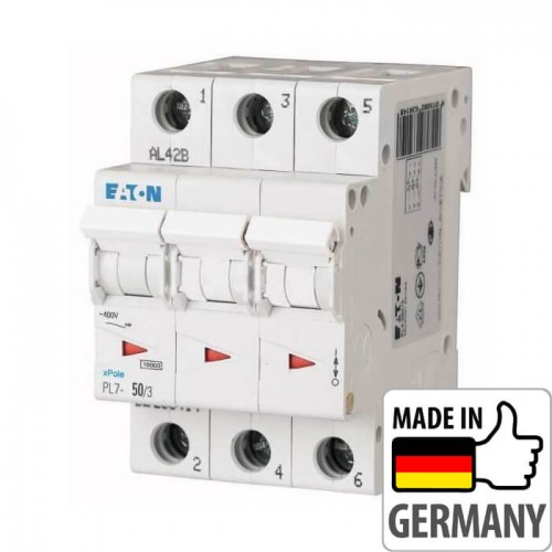 Автоматичний вимикач EATON серії PL7 призначений для захисту електричних ланцюгів від струмів короткого замикання та перенавантаження. Легко монтується на DIN-рейку, прямокутний індикатор положення контактів (увімкнено / вимкнено), можливість підключення додаткових пристроїв. Індикації номінального струму автоматичного вимикача - кольором керуючого важеля (у кложного намінала свій окремий колір). Автоматичні вимикачі серії PL7 дозволяють підводити живлення як зверху так і знизу.